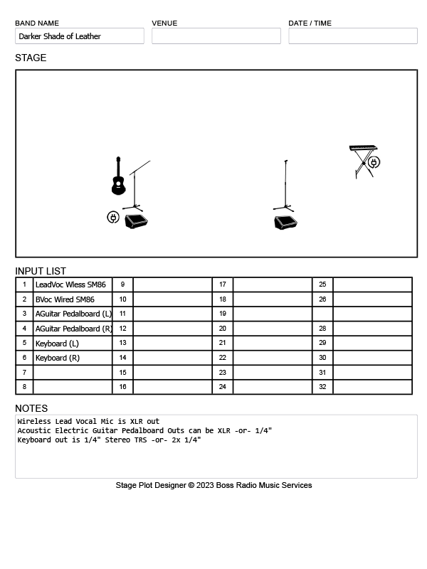 This is the typical stage plot for Darker Shade of Leather. Technical details about cable connections are included on the plot.